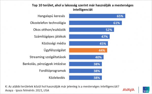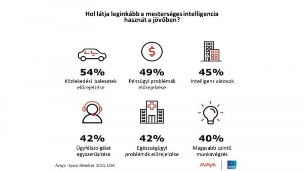 A felmérés szerint legnagyobb arányban (54%) azt várják az MI-től, hogy a jövőben a segítségével előre fogjuk látni a baleseteket és a pénzügyi problémákat (49%), de az ügyintézés egyszerűsödésére is közel ennyien, a válaszadók 42 százaléka számít. Ez utóbbi esetében azonban már nem a jövőről beszélünk. Az MI-n alapuló ügyfélszolgálatok ugyanis már most is rendelkezésre állnak: az Avaya Virtual Agent használatával például foglalhatunk úgy időpontot a fogorvosnál, megrendelhetünk egy terméket vagy elintézhetjük ügyeinket, hogy kizárólag mesterséges intelligenciával kommunikálunk.