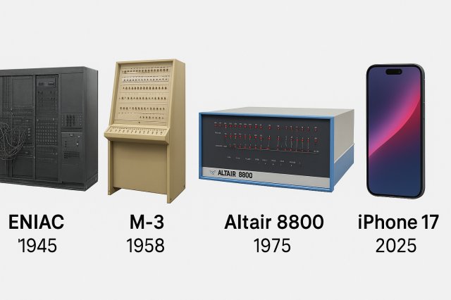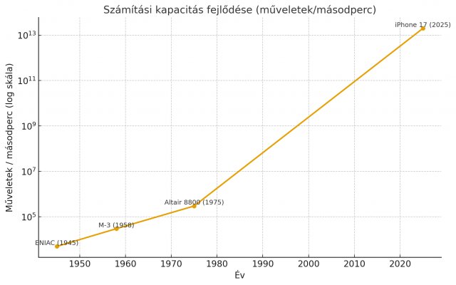 Azután jöttek azok a számítógépek, amiket akár haza is vihettünk, egy TV-vel összedugva installáltuk annak a számítási kapacitásnak a sokszorosát, amihez korábban álpadlós, álmennyezetes klimatizált géptermek kellettek. És akkor most, pusztán azért, hogy érzékeltessük ezeknek az egyre nagyobb számítási sebességeknek a valódi mértékét, ugorjunk napjainkhoz. Az Apple épp az iPhone 17 bejelentésére készül. Processzora A19 Bionic, 6 CPU-mag, 6 GPU-mag plusz neurális motor (a mesterséges intelligenciához és a gépi tanuláshoz). Zsebre rakható, akkumulátorról működik.