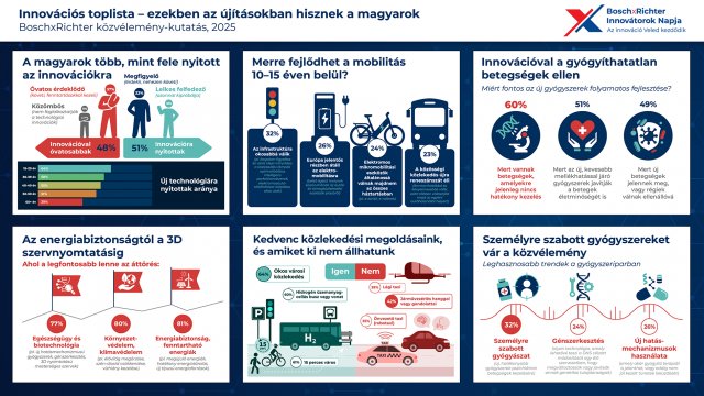 Ezekre a kérdésekre kereste a választ a magyarországi Bosch csoport és a Richter Gedeon Nyrt. közös kutatása, „Innovációs toplista: ezekben az újításokban hisznek a magyarok” címmel, amelynek friss eredményeit a BoschxRichter Innovátorok Napja konferencián mutatták be 2025. szeptember 23-án a Bosch Budapest Innovációs Kampuszon.