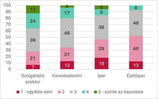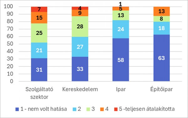 Jelentős különbségek mutatkoznak az egyes ágazatok között. A szolgáltatások és a kereskedelem területén erőteljesebben érezhető az AI hatása, míg az iparban és az építőiparban jóval visszafogottabb a technológia térnyerése. A szolgáltató szektorban a válaszadók közel fele tapasztal valamilyen piaci hatást, ezen belül 22% számolt be jelentős vagy teljes átalakulásról. A kereskedelemben a cégek 41%-a érzékel közepes vagy erős hatást, és 13% szerint az AI már most nagymértékben megváltoztatta a piacot.