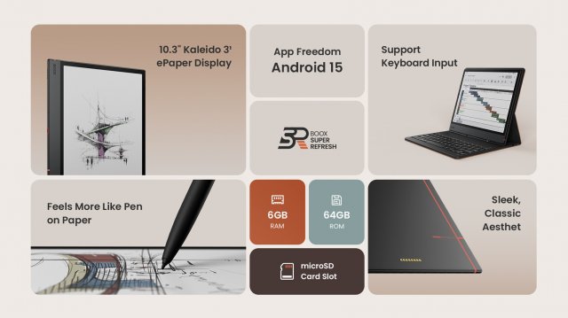 The Note Air5 C is the latest addition to the BOOX Note series, featuring a 10.3-inch Kaleido 3 color E Ink display designed for comfortable reading, writing, and creativity. With magnetic pogo pins, it seamlessly connects to a keyboard, turning the device into a portable workspace powered by Android 15. The improved textured screen paired with the new Pen3 stylus delivers a natural, paper-like writing experience. Advanced tools such as Smart Scribe, cloud sync, and flexible note-taking features support limitless creativity and productivity. With an octa-core processor, 6 GB RAM, and BOOX Super Refresh technology, the Note Air5 C ensures smooth multitasking in a slim, elegant design.