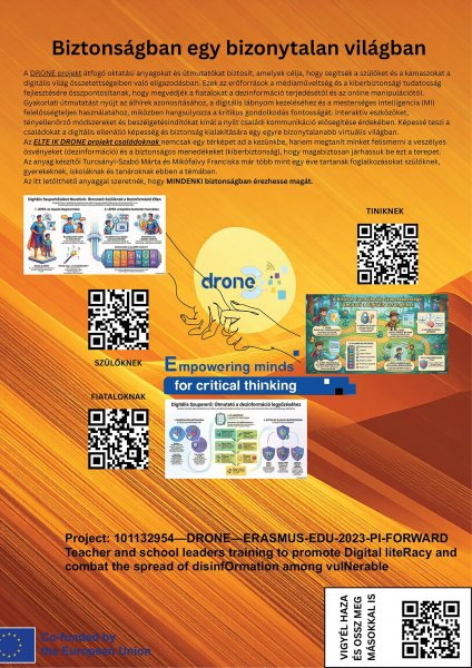 The ELTE Faculty of Informatics is coordinating the DRONE project, a three-year Erasmus+ initiative with a budget of nearly €1.5 million, aimed at strengthening resilience against online disinformation. The project develops educational materials for parents, primary school children, and teenagers to improve media literacy and cybersecurity awareness. These resources provide practical guidance on identifying fake news, managing digital footprints, and using artificial intelligence responsibly, while also encouraging open family communication about online risks. Nine European institutions participate in the project, and additional materials for teachers and school leaders are expected to be published in 2026. The initiative also plans career orientation workshops for upper primary and secondary school students.