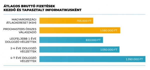 Havonta átlagosan bruttó 833 ezer forintot keresnek a legfeljebb egy éve dolgozó junior informatikusok, míg a 2–4 éves tapasztalattal rendelkezők már átlagosan 1,05 millió forintot visznek haza – derül ki a PROGmasters egyik legfrissebb kutatásából. A felmérésben 821, különböző IT-területeken végzett résztvevő közül 132-en válaszoltak.