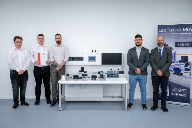 A felvételen Horváth Gergő, Lócsi Dániel és Füzi Gergő hallgatók, Korpai Richárd, az Informatikai és Villamosmérnöki Kar Automatizálási és Robotika Tanszékének oktatója, felkészítő tanár, illetve a kar dékánja, dr. Ballagi Áron látható. (Fotó: Adorján András/Széchenyi István Egyetem)