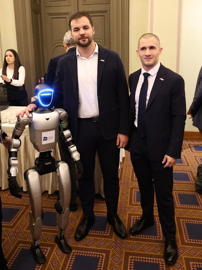 Kapu Tibor és Cserényi Gyula űrhajósok a humanoid robottal a Magyar Informatika Napján, MTA, 2026. Fotó: Sárai Judit, ÓE